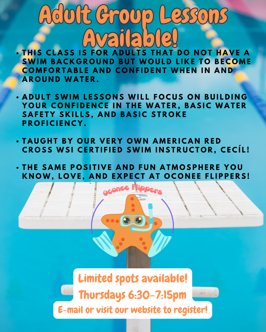 If you would like to enroll in a group or private lesson, please use the Parent Portal link to below to register! If you have questions, please email oconeeflippers@gmail.com.